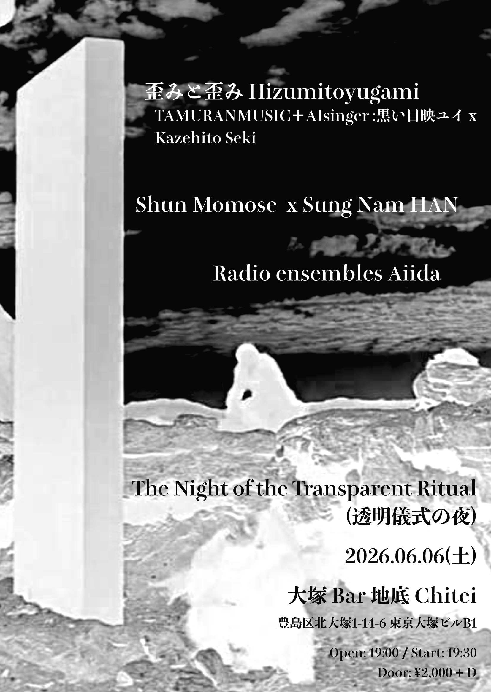 | 26.06.06 | The Night of the Transparent Ritual (透明儀式の夜) @ chitei, Kyoto ‣ Collab. w/ (TAMURANMUSIC+AIsinger: 黒い目映ユイ as Hizumitoyugami |